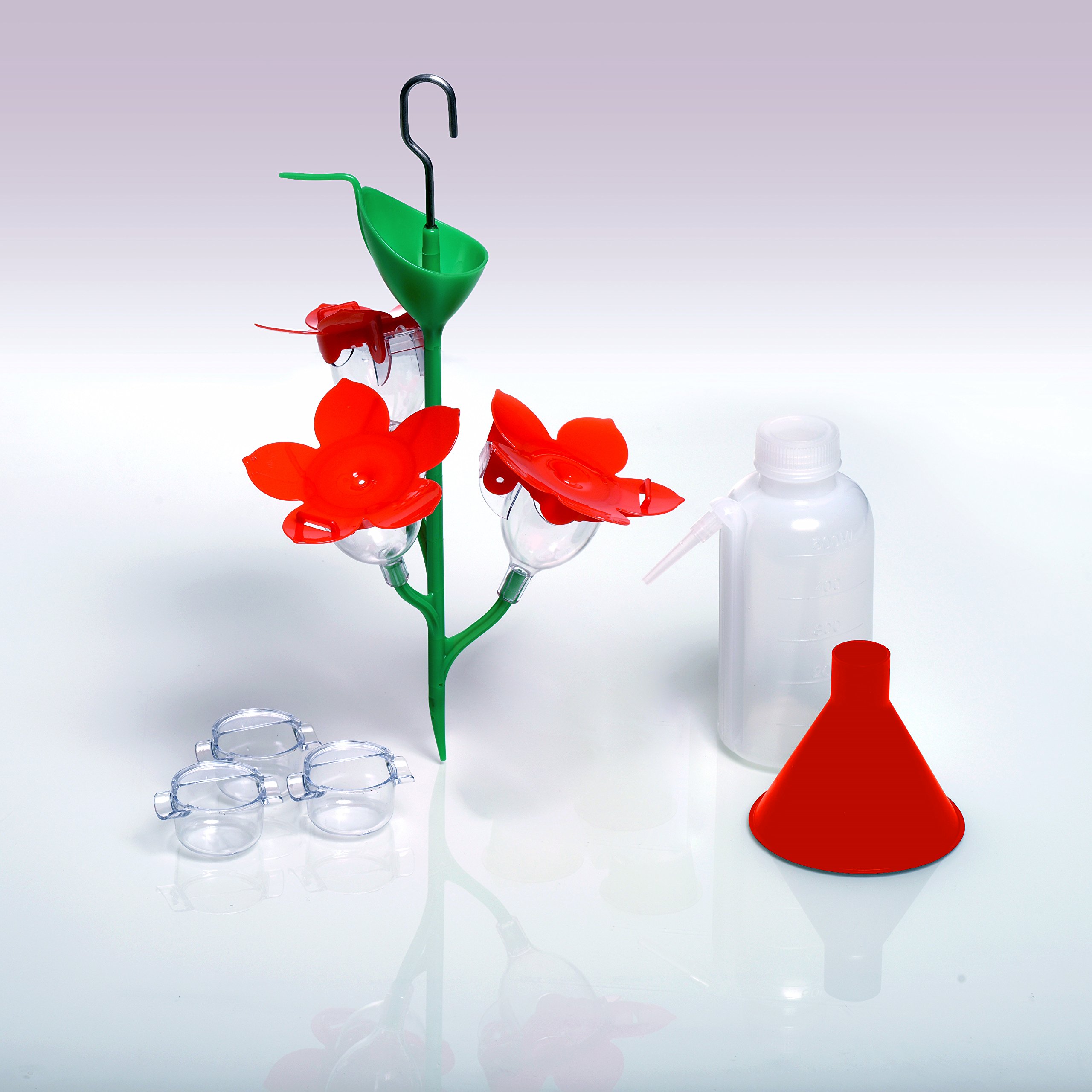 Your new Allura includes a squeeze bottle and a funnel. Store your nectar in the squeeze bottle in the refrigerator. When it’s time to refill your feeder, grab the squeeze bottle and head outside. Simply aim and squeeze!